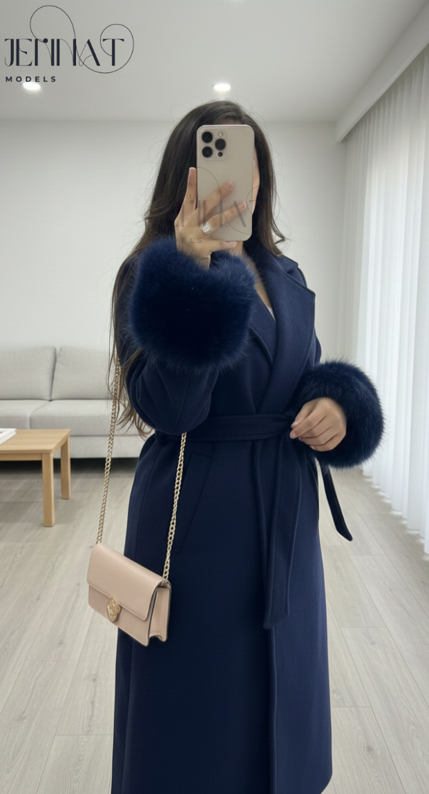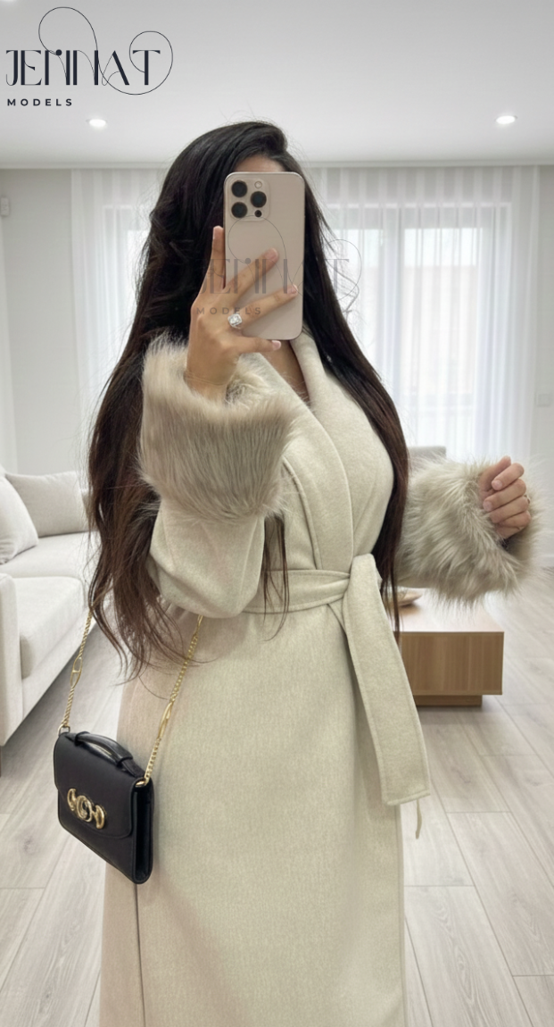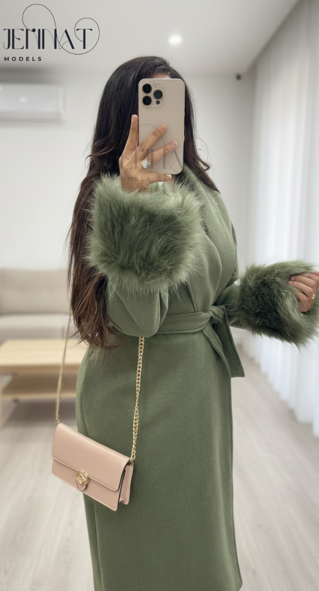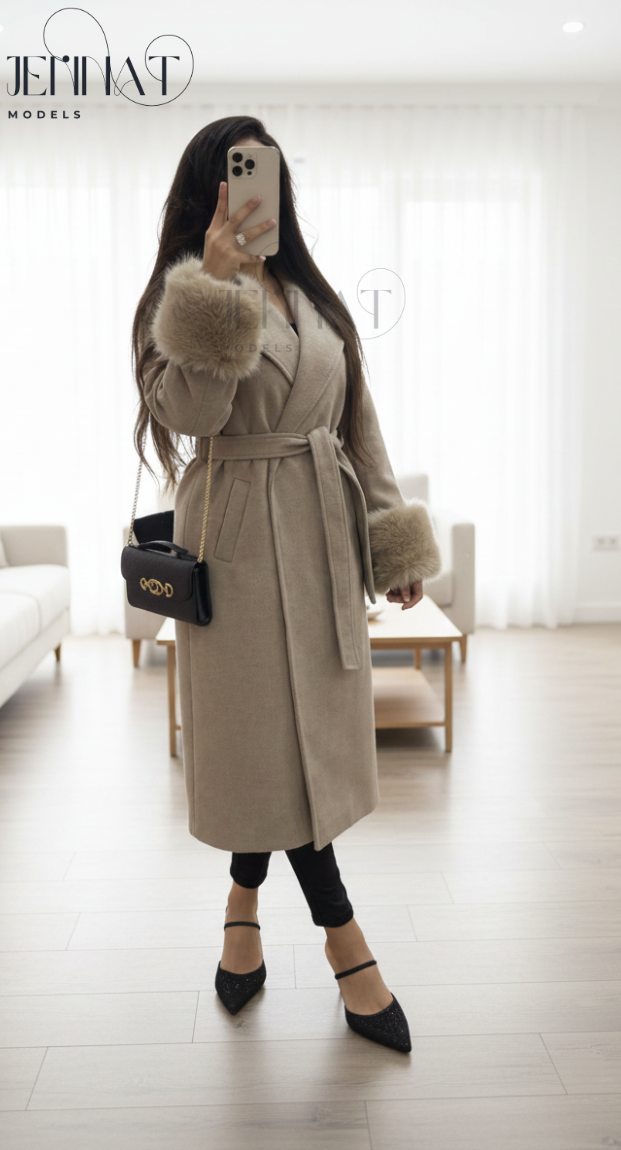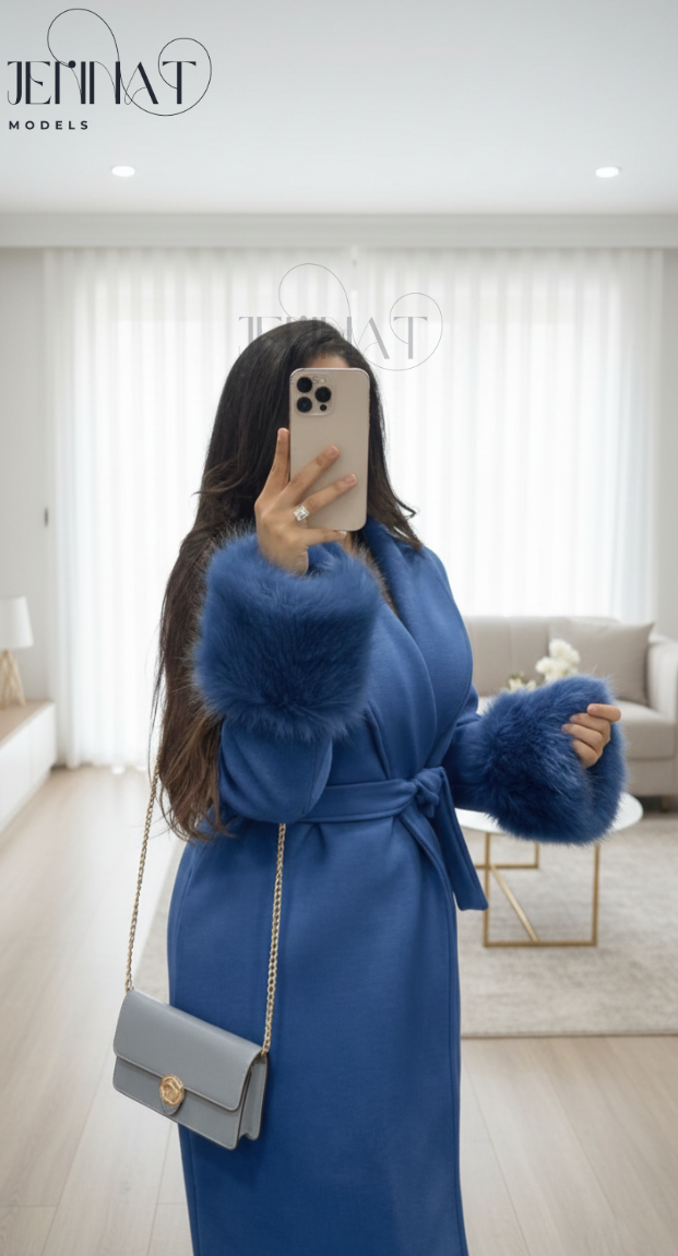 مزود بحزام لتحديد الخصر وأكمام مزينة بفرو ناعم كيعطي لمسة راقية ومميزة.